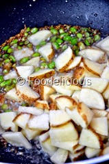 Tip in the sliced potatoes (I do not peel my potatoes) and also add salt to taste. Mix and cook covered.